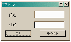 メニューと、ダイアログボックスのリソース・スクリプトです。 ダイアログボックスのスタイルにDS_CONTEXTHELP が含まれていることに注意してください。これで、ダイアログボックスの右上に 「?」マークのボタンが追加されます。VC++のリソースエディタでは ダイアログプロパティの「その他のスタイル」の「コンテキストヘルプ」に チェックを付けておきます。// help04.rcの一部 ///////////////////////////////////////////////////////////////////////////// // // Menu // MYMENU MENU DISCARDABLE BEGIN POPUP "ファイル(&F)" BEGIN MENUITEM "終了(&X)", IDM_END END POPUP "オプション(&O)" BEGIN MENUITEM "ダイアログボックス(&D)", IDM_DLG END END ///////////////////////////////////////////////////////////////////////////// // // Dialog // MYDLG DIALOG DISCARDABLE 0, 0, 130, 73 STYLE DS_MODALFRAME | DS_CONTEXTHELP | WS_POPUP | WS_CAPTION | WS_SYSMENU CAPTION "オプション" FONT 9, "MS Pゴシック" BEGIN DEFPUSHBUTTON "OK",IDOK,7,52,50,14 PUSHBUTTON "キャンセル",IDCANCEL,73,52,50,14 LTEXT "氏名",IDC_STATIC1,14,13,24,12 LTEXT "住所",IDC_STATIC2,15,35,26,11 EDITTEXT IDC_EDIT1,63,7,59,17,ES_AUTOHSCROLL EDITTEXT IDC_EDIT2,62,31,59,16,ES_AUTOHSCROLL END