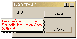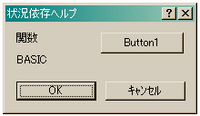 メニューとダイアログボックスのリソース・スクリプトです。// help05.rcの一部 ///////////////////////////////////////////////////////////////////////////// // // Menu // MYMENU MENU DISCARDABLE BEGIN POPUP "ファイル(&F)" BEGIN MENUITEM "終了(&X)", IDM_END END POPUP "オプション(&O)" BEGIN MENUITEM "ダイアログを出す(&D)", IDM_DLG END END ///////////////////////////////////////////////////////////////////////////// // // Dialog // MYDLG DIALOG DISCARDABLE 0, 0, 119, 65 STYLE DS_MODALFRAME | DS_CENTER | DS_CONTEXTHELP | WS_POPUP | WS_CAPTION | WS_SYSMENU CAPTION "状況依存ヘルプ" FONT 9, "MS Pゴシック" BEGIN DEFPUSHBUTTON "OK",IDOK,7,43,50,14 PUSHBUTTON "キャンセル",IDCANCEL,63,43,50,14 LTEXT "関数",IDC_STATIC1,7,7,15,8,SS_NOTIFY LTEXT "BASIC",IDC_STATIC2,7,23,20,8,SS_NOTIFY PUSHBUTTON "Button1",IDC_BUTTON1,60,7,52,15 END