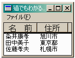 リストビューにアイテムやサブアイテムを挿入します。BOOL MySetListItem(HWND hList) { LVCOLUMN lc; LVITEM li; lc.mask = LVCF_WIDTH | LVCF_SUBITEM; lc.cx = 100; lc.iSubItem = 0; ListView_InsertColumn(hList, 0, &lc); lc.cx = 200; lc.iSubItem = 1; ListView_InsertColumn(hList, 1, &lc); li.mask = LVIF_TEXT; li.pszText = "粂井康孝"; li.iItem = 0; li.iSubItem = 0; ListView_InsertItem(hList, &li); li.pszText = "旭川市"; li.iItem= 0; li.iSubItem = 1; ListView_SetItem(hList, &li); li.pszText = "佐藤孝夫"; li.iItem = 1; li.iSubItem = 0; ListView_InsertItem(hList, &li); li.pszText = "札幌市"; li.iItem = 1; li.iSubItem = 1; ListView_SetItem(hList, &li); li.pszText = "田中美子"; li.iItem = 1; li.iSubItem = 0; ListView_InsertItem(hList, &li); li.pszText = "東京都"; li.iItem = 1; li.iSubItem = 1; ListView_SetItem(hList, &li); return TRUE; }