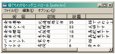 MYFONTDLGはフォント指定のダイアログボックスです。 MYFONTDLGのコンボボックスのIDを直接1136, 1138と数値で指定していることに 注意してください。フォント名を指定するコンボボックスはcmb1、サイズを 指定するコンボボックスはcmb3と決められています。これは、dlgs.hでは0x0470, 0x0472と定義されています。これを10進数に直すと1136, 1138となります。// header06.rc の一部 ///////////////////////////////////////////////////////////////////////////// // // Menu // MYMENU MENU DISCARDABLE BEGIN POPUP "ファイル(&F)" BEGIN MENUITEM "新規作成(&N)...", IDM_NEW MENUITEM "開く(&O)...", IDM_OPEN MENUITEM SEPARATOR MENUITEM "名前を付けて保存(&A)...", IDM_SAVEAS MENUITEM "上書き保存(&S)", IDM_SAVE, GRAYED MENUITEM SEPARATOR MENUITEM "終了(&X)", IDM_END END POPUP "編集(&E)" BEGIN MENUITEM "データの追加(&A)...", IDM_ADDITEM MENUITEM "データの削除(&D)...", IDM_DELITEM MENUITEM "データ編集(&I)...", IDM_EDITITEM END POPUP "オプション(&O)" BEGIN POPUP "フォントの変更(&F)" BEGIN MENUITEM "ヘッダコントロール(&H)...", IDM_HEADERFONT MENUITEM "リストビュー(&L)...", IDM_LISTFONT END END END ///////////////////////////////////////////////////////////////////////////// // // Dialog // ADDITEM DIALOG DISCARDABLE 0, 0, 143, 123 STYLE DS_MODALFRAME | DS_CENTER | WS_POPUP | WS_CAPTION | WS_SYSMENU CAPTION "データの追加" FONT 9, "MS Pゴシック" BEGIN EDITTEXT IDC_EDIT1,36,7,97,12,ES_AUTOHSCROLL EDITTEXT IDC_EDIT2,36,29,97,12,ES_AUTOHSCROLL EDITTEXT IDC_EDIT3,36,47,29,12,ES_AUTOHSCROLL | ES_NUMBER EDITTEXT IDC_EDIT4,36,63,99,33,ES_MULTILINE | ES_AUTOHSCROLL | ES_WANTRETURN DEFPUSHBUTTON "OK",IDOK,7,102,50,14 PUSHBUTTON "キャンセル",IDCANCEL,86,102,50,14 LTEXT "氏名:",IDC_STATIC,7,7,16,8 LTEXT "住所:",IDC_STATIC,7,29,16,8 LTEXT "年齢:",IDC_STATIC,7,49,16,8 LTEXT "備考:",IDC_STATIC,7,65,16,8 END MYFONTDLG DIALOG DISCARDABLE 0, 0, 115, 93 STYLE DS_MODALFRAME | WS_POPUP | WS_CAPTION | WS_SYSMENU CAPTION "フォント選択" FONT 9, "MS Pゴシック" BEGIN DEFPUSHBUTTON "OK",IDOK,7,73,44,14 PUSHBUTTON "キャンセル",IDCANCEL,61,73,44,14 COMBOBOX 1136,7,7,73,72,CBS_SIMPLE | CBS_SORT | WS_VSCROLL | WS_TABSTOP COMBOBOX 1138,85,7,19,71,CBS_SIMPLE | CBS_SORT | WS_VSCROLL | WS_TABSTOP END