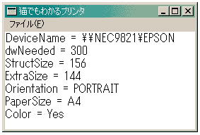 ちょっと面倒くさいのですが、最初のDocumentProperties関数の呼び出しの時は 最後の引数を0にします。そうすると情報を格納するのに十分なバッファサイズを 得ることができます。BOOL MyPrnInfo(HWND hWnd, char *szBuf) { HANDLE hPrn; PRINTDLG pd; DEVMODE *lpDM; char szPrnName[256], szTemp[256]; DWORD dwNeeded; HGLOBAL hMem; DEVMODE *pDev; memset(szPrnName, '\0', sizeof(szPrnName)); memset(&pd, 0, sizeof(PRINTDLG)); pd.lStructSize = sizeof(PRINTDLG); pd.Flags = PD_RETURNDEFAULT; pd.hDevMode = NULL; pd.hDevNames = NULL; if (PrintDlg(&pd) == IDOK) { lpDM = (DEVMODE *)GlobalLock(pd.hDevMode); if (lpDM == NULL) { MessageBox(hWnd, "メモリブロックをロックできません", "Error", MB_OK); return FALSE; } strcpy(szPrnName, (LPSTR)(lpDM->dmDeviceName)); if (OpenPrinter(szPrnName, &hPrn, NULL) == 0) { MessageBox(hWnd, "プリンタをオープンできません", "Error", MB_OK); GlobalUnlock(pd.hDevMode); GlobalFree(pd.hDevMode); return FALSE; } //1回目の呼び出しで必要なバッファサイズを求める dwNeeded = DocumentProperties(hWnd, hPrn, szPrnName, NULL, NULL, 0); hMem = GlobalAlloc(GHND, dwNeeded); if (hMem == NULL) { MessageBox(hWnd, "バッファのためのメモリを確保できません", "Error", MB_OK); ClosePrinter(hPrn); GlobalUnlock(pd.hDevMode); GlobalFree(pd.hDevMode); return FALSE; } pDev = (DEVMODE *)GlobalLock(hMem); if (pDev == NULL) { MessageBox(hWnd, "GlobalLockに失敗しました", "Error", MB_OK); GlobalFree(hMem); ClosePrinter(hPrn); GlobalUnlock(pd.hDevMode); GlobalFree(pd.hDevMode); return FALSE; } //2回目の呼び出しの時は5番目の引数をNULLにして、6番目の引数をDM_OUT_BUFFERに if (DocumentProperties(hWnd, hPrn, szPrnName, pDev, NULL, DM_OUT_BUFFER) < 0) { MessageBox(hWnd, "DocumentProperties関数が失敗しました", "Error", MB_OK); GlobalFree(hMem); ClosePrinter(hPrn); GlobalUnlock(pd.hDevMode); GlobalFree(pd.hDevMode); return FALSE; } //DEVMODE構造体から必要な情報をszBufにコピー wsprintf(szBuf, "DeviceName = %s\n", pDev->dmDeviceName); wsprintf(szTemp, "dwNeeded = %d\n", dwNeeded); strcat(szBuf, szTemp); wsprintf(szTemp, "StructSize = %d\n", pDev->dmSize); strcat(szBuf, szTemp); wsprintf(szTemp, "ExtraSize = %d\n", pDev->dmDriverExtra); strcat(szBuf, szTemp); if (pDev->dmFields & DM_ORIENTATION) { if (pDev->dmOrientation == 1) strcpy(szTemp, "PORTRAIT\n"); else strcpy(szTemp, "LANDSCAPE\n"); strcat(szBuf, "Orientation = "); strcat(szBuf, szTemp); } if (pDev->dmFields & DM_PAPERSIZE) { if (pDev->dmPaperSize == DMPAPER_A4) { strcpy(szTemp, "PaperSize = A4\n"); } else if (pDev->dmPaperSize == DMPAPER_A5) { strcpy(szTemp, "PaperSize = A5\n"); } else { strcpy(szTemp, "PaperSize = A4/A5以外\n"); } strcat(szBuf, szTemp); } if (pDev->dmFields & DM_COPIES) { wsprintf(szTemp, "Copies = %d\n", pDev->dmCopies); strcat(szBuf, szTemp); } if (pDev->dmFields & DM_PRINTQUALITY) { if (pDev->dmPrintQuality == DMRES_HIGH) strcpy(szTemp, "Quality = HIGH\n"); else if (pDev->dmPrintQuality == DMRES_MEDIUM) strcpy(szTemp, "Quality = MEDIUM\n"); else if (pDev->dmPrintQuality == DMRES_LOW) strcpy(szTemp, "Quality = LOW\n"); else if (pDev->dmPrintQuality == DMRES_DRAFT) strcpy(szTemp, "Quality = DRAFT\n"); else strcpy(szTemp, "Quality = Unknwon\n"); strcat(szBuf, szTemp); } if (pDev->dmFields & DM_COLOR) { if (pDev->dmColor == DMCOLOR_COLOR) strcpy(szTemp, "Color = Yes\n"); else if (pDev->dmColor == DMCOLOR_MONOCHROME) strcpy(szTemp, "Color = No\n"); else strcpy(szTemp, "Color = Unknown\n"); strcat(szBuf, szTemp); } InvalidateRect(hWnd, NULL, TRUE); ClosePrinter(hPrn); GlobalUnlock(hMem); if (GlobalFree(hMem) != NULL) { MessageBox(hWnd, "GlobalFree(hMem) が失敗しました", "Error", MB_OK); } GlobalUnlock(pd.hDevMode); if (GlobalFree(pd.hDevMode) != NULL) { MessageBox(hWnd, "GlobalFree Error", "Error", MB_OK); return FALSE; } return TRUE; } MessageBox(hWnd, "関数は失敗しました", "Error", MB_OK); return FALSE; }