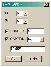 すると左の図のようなダイアログボックスが出るので、必要な項目を 設定します。そうすると何も記入されていないテーブルタグが 挿入されます。この<TD></TD>タグに内容を入れていきます。