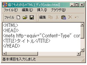 「元に戻す」「切り取り」「コピー」「貼り付け」「削除」「すべて選択」などの メニュー項目が増えました。// htmledit05.rcの一部 ///////////////////////////////////////////////////////////////////////////// // // Menu // MYMENU MENU DISCARDABLE BEGIN POPUP "ファイル(&F)" BEGIN MENUITEM "新規作成(&N)...", IDM_NEW MENUITEM "開く(&O)...", IDM_OPEN MENUITEM SEPARATOR MENUITEM "上書き保存(&S)", IDM_SAVE MENUITEM "名前を付けて保存(&A)...", IDM_SAVEAS MENUITEM SEPARATOR MENUITEM "アプリケーションの終了(&X)", IDM_END END POPUP "編集(&E)" BEGIN MENUITEM "元に戻す(&U)", IDM_UNDO MENUITEM "切り取り(&T)", IDM_CUT MENUITEM "コピー(&C)", IDM_COPY MENUITEM "貼り付け(&P)", IDM_PASTE MENUITEM "削除(&D)", IDM_DELETE MENUITEM SEPARATOR MENUITEM "すべて選択(&L)", IDM_ALL END POPUP "挿入(&I)" BEGIN MENUITEM "基本項目入力(&B)...", IDM_BASICINPUT MENUITEM SEPARATOR POPUP "タグの挿入" BEGIN MENUITEM "<P>", IDM_P MENUITEM "<BR>", IDM_BR MENUITEM "<H*></H*>...", IDM_H MENUITEM "<IMG>...", IDM_IMAGE MENUITEM "<A HREF></A>...", IDM_A MENUITEM "<TABLE></TABLE>...", IDM_TABLE MENUITEM "<FORM></FORM>...", IDM_FORM MENUITEM "<INPUT>...", IDM_INPUT END POPUP "JavaScriptの挿入" BEGIN MENUITEM "<SCRIPT>", IDM_SCRIPT END END POPUP "ブラウザ(&B)" BEGIN MENUITEM "ブラウザ起動(&E)", IDM_BROWSER END END ///////////////////////////////////////////////////////////////////////////// // // Dialog // MYBASICINPUT DIALOG DISCARDABLE 0, 0, 187, 121 STYLE DS_MODALFRAME | WS_POPUP | WS_CAPTION | WS_SYSMENU CAPTION "基本項目入力" FONT 9, "MS Pゴシック" BEGIN EDITTEXT IDC_EDIT1,39,7,141,14,ES_AUTOHSCROLL EDITTEXT IDC_EDIT2,39,27,141,14,ES_AUTOHSCROLL EDITTEXT IDC_EDIT3,39,47,141,14,ES_AUTOHSCROLL DEFPUSHBUTTON "OK",IDOK,39,100,50,14 PUSHBUTTON "キャンセル",IDCANCEL,96,100,50,14 LTEXT "タイトル",IDC_STATIC,7,7,23,8 LTEXT "作者",IDC_STATIC,7,30,15,8 LTEXT "E-Mail",IDC_STATIC,7,47,20,8 CONTROL "色",IDC_RADIO1,"Button",BS_AUTORADIOBUTTON,35,76,23,10 CONTROL "壁紙",IDC_RADIO2,"Button",BS_AUTORADIOBUTTON,67,76,32, 10 GROUPBOX "背景",IDC_STATIC,26,67,133,26 CONTROL "指定しない",IDC_RADIO3,"Button",BS_AUTORADIOBUTTON,108, 76,46,10 END MYHTAG DIALOG DISCARDABLE 0, 0, 187, 93 STYLE DS_MODALFRAME | DS_CENTER | WS_POPUP | WS_CAPTION | WS_SYSMENU CAPTION "見出しタグの挿入" FONT 9, "MS Pゴシック" BEGIN DEFPUSHBUTTON "OK",IDOK,40,72,50,14 PUSHBUTTON "キャンセル",IDCANCEL,95,72,50,14 COMBOBOX IDC_COMBO1,51,7,18,68,CBS_DROPDOWN | CBS_SORT | WS_VSCROLL | WS_TABSTOP LTEXT "大きさ",IDC_STATIC,7,7,32,11 LTEXT "コンテンツ",IDC_STATIC,7,27,39,10 EDITTEXT IDC_EDIT1,51,27,129,32,ES_MULTILINE | ES_AUTOHSCROLL | ES_WANTRETURN END MYIMGTAG DIALOG DISCARDABLE 0, 0, 187, 91 STYLE DS_MODALFRAME | DS_CENTER | WS_POPUP | WS_CAPTION | WS_SYSMENU CAPTION "イメージの挿入" FONT 9, "MS Pゴシック" BEGIN DEFPUSHBUTTON "OK",IDOK,43,70,41,14 PUSHBUTTON "キャンセル",IDCANCEL,101,70,41,14 CONTROL "パス付き",IDC_CHECK1,"Button",BS_AUTOCHECKBOX | WS_TABSTOP,7,7,42,15 EDITTEXT IDC_EDIT1,50,7,107,16,ES_AUTOHSCROLL LTEXT "ファイル名",IDC_STATIC,7,33,38,11 EDITTEXT IDC_EDIT2,50,29,107,16,ES_AUTOHSCROLL PUSHBUTTON "参照",IDC_BUTTON1,160,31,20,15 CONTROL "画像を確認する",IDC_CHECK2,"Button",BS_AUTOCHECKBOX | WS_TABSTOP,7,52,61,15 END MYTABLETAG DIALOG DISCARDABLE 0, 0, 95, 133 STYLE DS_MODALFRAME | DS_CENTER | WS_POPUP | WS_CAPTION | WS_SYSMENU CAPTION "テーブルの挿入" FONT 9, "MS Pゴシック" BEGIN DEFPUSHBUTTON "OK",IDOK,7,112,33,14 PUSHBUTTON "キャンセル",IDCANCEL,46,112,33,14 LTEXT "行",IDC_STATIC,7,7,11,10 COMBOBOX IDC_COMBO1,29,7,23,58,CBS_DROPDOWN | WS_VSCROLL | WS_TABSTOP LTEXT "列",IDC_STATIC,7,27,11,10 COMBOBOX IDC_COMBO2,29,25,23,55,CBS_DROPDOWN | WS_VSCROLL | WS_TABSTOP CONTROL "BORDER",IDC_CHECK1,"Button",BS_AUTOCHECKBOX | WS_TABSTOP,7,49,41,12 EDITTEXT IDC_EDIT1,51,48,34,14,ES_AUTOHSCROLL CONTROL "CAPTION",IDC_CHECK2,"Button",BS_AUTOCHECKBOX | WS_TABSTOP,7,67,44,12 COMBOBOX IDC_COMBO3,51,67,34,45,CBS_DROPDOWN | CBS_SORT | WS_VSCROLL | WS_TABSTOP EDITTEXT IDC_EDIT2,17,89,71,14,ES_AUTOHSCROLL END MYFORMTAG DIALOG DISCARDABLE 0, 0, 187, 103 STYLE DS_MODALFRAME | WS_POPUP | WS_CAPTION | WS_SYSMENU CAPTION "フォームの挿入" FONT 9, "MS Pゴシック" BEGIN DEFPUSHBUTTON "OK",IDOK,38,82,50,14 PUSHBUTTON "キャンセル",IDCANCEL,97,82,50,14 CONTROL "METHOD",IDC_CHECK1,"Button",BS_AUTOCHECKBOX | WS_TABSTOP,7,7,47,12 COMBOBOX IDC_COMBO1,65,7,52,41,CBS_DROPDOWN | CBS_SORT | WS_VSCROLL | WS_TABSTOP CONTROL "ACTION",IDC_CHECK2,"Button",BS_AUTOCHECKBOX | WS_TABSTOP,7,25,43,12 EDITTEXT IDC_EDIT1,65,25,114,12,ES_AUTOHSCROLL CONTROL "NAME",IDC_CHECK3,"Button",BS_AUTOCHECKBOX | WS_TABSTOP, 7,43,34,12 EDITTEXT IDC_EDIT2,65,43,114,12,ES_AUTOHSCROLL CONTROL "ID",IDC_CHECK4,"Button",BS_AUTOCHECKBOX | WS_TABSTOP,7, 61,32,12 EDITTEXT IDC_EDIT3,65,61,114,12,ES_AUTOHSCROLL END MYINPUTTAG DIALOG DISCARDABLE 0, 0, 135, 203 STYLE DS_MODALFRAME | WS_POPUP | WS_CAPTION | WS_SYSMENU CAPTION "INPUTの挿入" FONT 9, "MS Pゴシック" BEGIN DEFPUSHBUTTON "OK",IDOK,17,182,50,14 PUSHBUTTON "キャンセル",IDCANCEL,71,182,50,14 LTEXT "TYPE",IDC_STATIC,7,7,24,9 COMBOBOX IDC_COMBO1,49,7,45,92,CBS_DROPDOWN | CBS_SORT | WS_VSCROLL | WS_TABSTOP CONTROL "NAME",IDC_CHECK2,"Button",BS_AUTOCHECKBOX | WS_TABSTOP, 7,48,35,14 CONTROL "ID",IDC_CHECK3,"Button",BS_AUTOCHECKBOX | WS_TABSTOP,7, 67,25,14 CONTROL "onClick",IDC_CHECK4,"Button",BS_AUTOCHECKBOX | WS_TABSTOP,7,86,35,14 EDITTEXT IDC_EDIT4,49,87,75,13,ES_AUTOHSCROLL EDITTEXT IDC_EDIT2,49,49,75,13,ES_AUTOHSCROLL EDITTEXT IDC_EDIT3,49,67,75,13,ES_AUTOHSCROLL EDITTEXT IDC_EDIT1,49,29,75,13,ES_AUTOHSCROLL CONTROL "VALUE",IDC_CHECK1,"Button",BS_AUTOCHECKBOX | WS_TABSTOP, 7,29,37,14 CONTROL "onBlur",IDC_CHECK5,"Button",BS_AUTOCHECKBOX | WS_TABSTOP,7,105,36,14 EDITTEXT IDC_EDIT5,49,105,75,13,ES_AUTOHSCROLL CONTROL "onChange",IDC_C