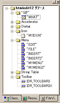 メニュー・リソースに"What's New"が加わりました。3カ所あるので 注意してください。// htmledit12.rcの一部 ///////////////////////////////////////////////////////////////////////////// // // Menu // MYMENU MENU DISCARDABLE BEGIN POPUP "ファイル(&F)" BEGIN MENUITEM "新規作成(&N)...\tCtrl+N", IDM_NEW MENUITEM "開く(&O)...\tCtrl+O", IDM_OPEN MENUITEM SEPARATOR MENUITEM "上書き保存(&S)\tCtrl+S", IDM_SAVE MENUITEM "名前を付けて保存(&A)...", IDM_SAVEAS MENUITEM SEPARATOR MENUITEM "アプリケーションの終了(&X)", IDM_END END POPUP "編集(&E)" BEGIN MENUITEM "元に戻す(&U)\tCtrl+Z", IDM_UNDO MENUITEM "切り取り(&T)\tCtrl+X", IDM_CUT MENUITEM "コピー(&C)\tCtrl+C", IDM_COPY MENUITEM "貼り付け(&P)\tCtrl+V", IDM_PASTE MENUITEM "削除(&D)\tCtrl+D", IDM_DELETE MENUITEM SEPARATOR MENUITEM "すべて選択(&L)\tCtrl+A", IDM_ALL END POPUP "挿入(&I)" BEGIN MENUITEM "基本項目入力(&B)...\tShift+Ctrl+B", IDM_BASICINPUT MENUITEM SEPARATOR POPUP "タグの挿入" BEGIN MENUITEM "<P>", IDM_P MENUITEM "<BR>", IDM_BR MENUITEM "<H*></H*>...", IDM_H MENUITEM "<IMG>...", IDM_IMAGE MENUITEM "<A HREF></A>...", IDM_A MENUITEM "<TABLE></TABLE>...", IDM_TABLE MENUITEM "<FORM></FORM>...", IDM_FORM MENUITEM "<INPUT>...", IDM_INPUT END POPUP "JavaScriptの挿入" BEGIN MENUITEM "<SCRIPT>", IDM_SCRIPT END POPUP "GIF画像" BEGIN MENUITEM "What's New", IDM_WHAT END END POPUP "ブラウザ(&B)" BEGIN MENUITEM "ブラウザ起動(&E)\tF12", IDM_BROWSER END POPUP "オプション(&O)" BEGIN POPUP "ツールチップ(&T)" BEGIN MENUITEM "文字色(&L)", IDM_TIPTXTCOLOR MENUITEM "背景色(&B)", IDM_TIPBKCOLOR END END END INSERT MENU DISCARDABLE BEGIN POPUP "ダミーです" BEGIN MENUITEM "<P>", IDM_P MENUITEM "<BR>", IDM_BR MENUITEM "<H*></H*>...", IDM_H MENUITEM "<IMG>...", IDM_IMAGE MENUITEM "<A HREF></A>...", IDM_A MENUITEM "<TABLE></TABLE>...", IDM_TABLE MENUITEM "<FORM></FORM>...", IDM_FORM MENUITEM "<INPUT>...", IDM_INPUT END END FILE MENU DISCARDABLE BEGIN POPUP "ダミーです" BEGIN MENUITEM "新規作成", IDM_NEW MENUITEM "開く", IDM_OPEN MENUITEM "上書き保存", IDM_SAVE END END EDIT MENU DISCARDABLE BEGIN POPUP "ダミーです" BEGIN MENUITEM "コピー", IDM_COPY MENUITEM "切り取り", IDM_CUT MENUITEM "貼り付け", IDM_PASTE MENUITEM "削除", IDM_DELETE MENUITEM "元に戻す", IDM_UNDO END END INSERT2 MENU DISCARDABLE BEGIN POPUP "ダミーです" BEGIN MENUITEM "基本項目入力", IDM_BASICINPUT MENUITEM "JavaScriptの挿入", IDM_SCRIPT POPUP "タグの挿入" BEGIN MENUITEM "<P>", IDM_P MENUITEM "<BR>", IDM_BR MENUITEM "<H*></H*>...", IDM_H MENUITEM "<IMG>...", IDM_IMAGE MENUITEM "<A HREF></A>...", IDM_A MENUITEM "<TABLE></TABLE>...", IDM_TABLE MENUITEM "<FORM></FORM>...", IDM_FORM MENUITEM "<INPUT>...", IDM_INPUT END POPUP "GIF画像" BEGIN MENUITEM "What's New", IDM_WHAT END END END MYMENU2 MENU DISCARDABLE BEGIN POPUP "ダミーです" BEGIN POPUP "ファイル(&F)" BEGIN MENUITEM "新規作成(&N)...\tCtrl+N", IDM_NEW MENUITEM "開く(&O)...\tCtrl+O", IDM_OPEN MENUITEM SEPARATOR MENUITEM "上書き保存(&S)\tCtrl+S", IDM_SAVE MENUITEM "名前を付けて保存(&A)...", IDM_SAVEAS MENUITEM SEPARATOR MENUITEM "アプリケーションの終了(&X)", IDM_END END POPUP "編集" BEGIN MENUITEM "元に戻す(&U)\tCtrl+Z", IDM_UNDO MENUITEM "切り取り(&T)\tCtrl+X", IDM_CUT MENUITEM "コピー(&C)\tCtrl+C", IDM_COPY MENUITEM "貼り付け(&]P)\tCtrl+V", IDM_PASTE MENUITEM "削除(&D)\tCtrl+D", IDM_DELETE MENUITEM SEPARATOR MENUITEM "すべて選択(&L)\tCtrl+A", IDM_ALL END POPUP "挿入(&I)" BEGIN MENUITEM "基本項目(&B)\tShift+Ctrl+B", IDM_BASICINPUT MENUITEM SEPARATOR POPUP "タグの挿入" BEGIN MENUITEM "<P>", IDM_P MENUITEM "<BR>", IDM_BR MENUITEM "<H*></H*>...", IDM_H MENUITEM "<IMG>...", IDM_IMAGE MENUITEM "<A HREF></A>...", IDM_A MENUITEM "<TABLE></TABLE>...", IDM_TABLE MENUITEM "<FORM></FORM>...", IDM_FORM MENUITEM "<INPUT>...", IDM_INPUT END POPUP "JavaScriptの挿入" BEGIN MENUITEM "<SCRIPT>", IDM_SCRIPT END POPUP "GIF画像" BEGIN MENUITEM "What's New", IDM_WHAT END END POPUP "ブラウザ(&B)" BEGIN MENUITEM "ブラウザの起動(&B)\tF12", IDM_BROWSER END POPUP "オプション(&O)" BEGIN POPUP "ツールチップ(&T)" BEGIN MENUITEM "文字色(&L)", IDM_TIPTXTCOLOR MENUITEM "背景色(&B)", IDM_TIPBKCOLOR END END END END ///////////////////////////////////////////////////////////////////////////// // // Dialog // MYBASICINPUT DIALOG DISCARDABLE 0, 0, 187, 121 STYLE DS_MODALFRAME | WS_POPUP | WS_CAPTION | WS_SYSMENU CAPTION "基本項目入力" FONT 9, "MS Pゴシック" BEGIN EDITTEXT IDC_EDIT1,39,7,141,14,ES_AUTOHSCROLL EDITTEXT IDC_EDIT2,39,27,141,14,ES_AUTOHSCROLL EDITTEXT IDC_EDIT3,39,47,141,14,ES_AUTOHSCROLL DEFPUSHBUTTON "OK",IDOK,39,100,50,14 PUSHBUTTON "キャンセル",IDCANCEL,96,100,50,14 LTEXT "タイトル",IDC_STATIC,7,7,23,8 LTEXT "作者",IDC_STATIC,7,30,15,8 LTEXT "E-Mail",IDC_STATIC,7,47,20,8 CONTROL "色",IDC_RADIO1,"Button",BS_AUTORADIOBUTTON,35,76,23,10 CONTROL "壁紙",IDC_RADIO2,"Button",BS_AUTORADIOBUTTON,67,76,32, 10 GROUPBOX "背景",IDC_STATIC,26,67,133,26 CONTROL "指定しない",IDC_RADIO3,"Button",BS_AUTORADIOBUTTON,108, 76,46,10 END MYHTAG DIALOG DISCARDABLE 0, 0, 187, 93 STYLE DS_MODALFRAME | DS_CENTER | WS_POPUP | WS_CAPTION | WS_SYSMENU CAPTION "見出しタグの挿入" FONT 9, "MS Pゴシック" BEGIN COMBOBOX IDC_COMBO1,51,7,18,68,CBS_DROPDOWN | CBS_SORT | WS_VSCROLL | WS_TABSTOP EDITTEXT IDC_EDIT1,51,27,129,32,ES_MULTILINE | ES_AUTOHSCROLL | ES_WANTRETURN DEFPUSHBUTTON "OK",IDOK,40,72,50,14 PUSHBUTTON "キャンセル",IDCANCEL,95,72,50,14 LTEXT "大きさ",IDC_STATIC,7,7,32,11 LTEXT "コンテンツ",IDC_STATIC,7,27,39,10 END MYIMGTAG DIALOG DISCARDABLE 0, 0, 187, 91 STYLE DS_MODALFRAME | DS_CENTER | WS_POPUP | WS_CAPTION | WS_SYSMENU CAPTION "イメージの挿入" FONT 9, "MS Pゴシック" BEGIN DEFPUSHBUTTON "OK",IDOK,43,70,41,14 PUSHBUTTON "キ