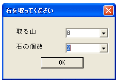 もちろん、山の石がマイナスになったり、すべての山の石が0になるような取り方は できません。今回はコンピュータは乱数を発生してでたらめに石を取るので弱いです。