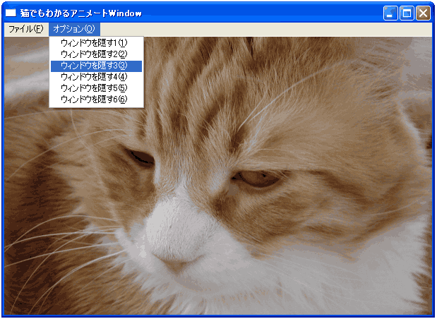 メニューからIDM_HIDE1からIDM_HIDE6までが選択されたら、いろいろな組み合わせで ウィンドウを隠して、0.5秒後にまた出しています。