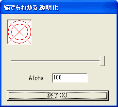 そうすると、そのWindowのアルファが指定数値のものになります。(100が完全不透明、0が完全透明)。この数値を変更するには、スライダーを動かすか、エディットコントロールに直接数値を書き込みます。