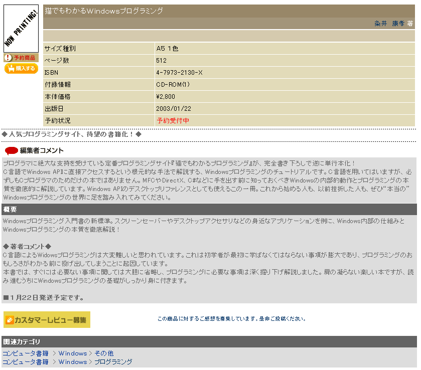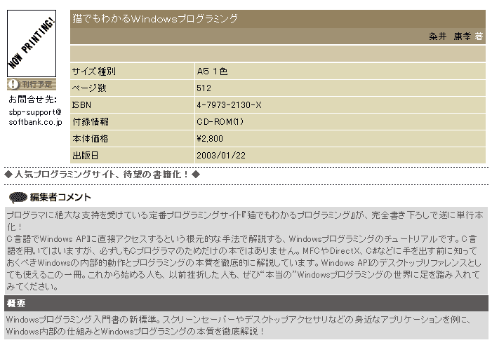「猫でもわかるWindowsプログラミング」が本日(2003/01/22)