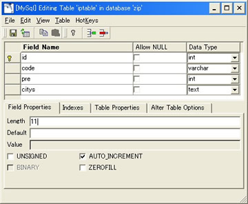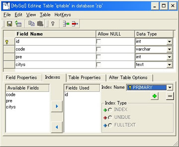 - それでは、UNIX/LinuxのMySQLで説明した郵便番号を管理するデータベースを作成してみましょう。