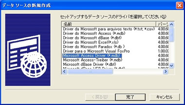 - ドライバー一覧が表示されますので、「Microsoft Access Driver (*.mdb)」を選択し、[完了]を押します。