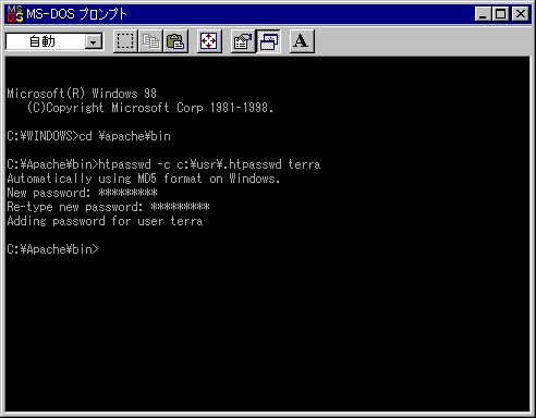 パスワード発行プログラムhtpasswd.exeは、Apacheをインストールしたディレクトリのbinディレクトリに有ります。