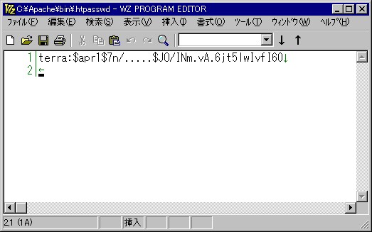 Apacheではパスワードファイルを暗号化して保存しますので、テキストファイルで自由に作成する事はできません。