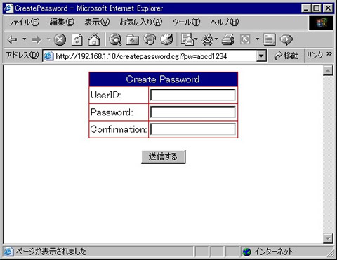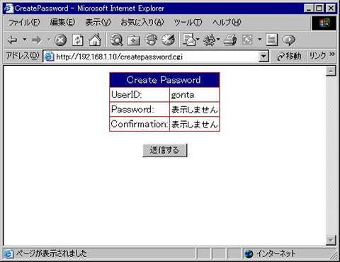 コマンドラインからのパスワードの登録が出来ましたので、一応使用することは可能となりましたが、 毎回コマンドラインから追加するのも厄介です。そこでCGIを使って自動的に登録するスクリプトを紹介しましょう。