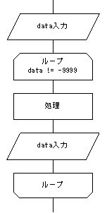 例、-9999が入力されるまで処理を繰り返す フローチャート プログラム scanf("%d", &data); while (data != -9999) { 処理; scanf("%d", &data); }