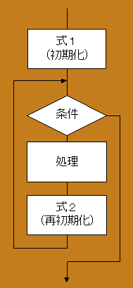 条件を満たしている間、{}内の処理を繰り返す。- 式1は、ループに入る前に一度だけ実行される。通常はくり返し回数を格納する変数(ループ変数)の初期化に使用する。