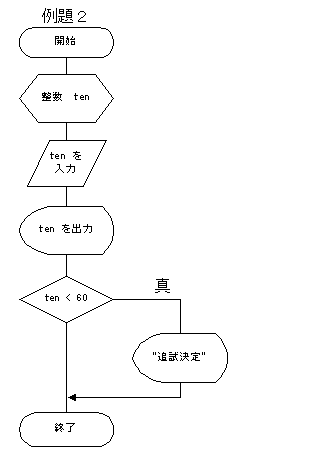整数変数tenの値が60未満なら「追試」と表示するプログラム。