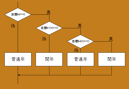 /* 閏年判定プログラム */ #include <stdio.h> main() { int year; printf("西暦を入力:"); scanf("%d", &year); if (year%4 == 0) { if (year%100 == 0) { if (year%400 == 0) { printf("西暦 %d 年は閏年\n", year); } else { printf("西暦 %d 年は普通年\n", year); } } else { printf("西暦 %d 年は閏年\n", year); } } else { printf("西暦 %d 年は普通年\n", year); } }