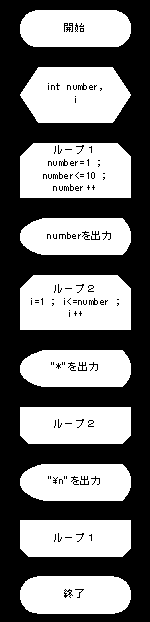 /* 1から10までの数値と*を表示 */ #include <stdio.h> main() { int number, i; for (number=1 ; number<=10 ; number++) { printf("%02d : ", number); for (i=1 ; i<=number ; i++) { printf("*"); } printf("\n"); } }練習問題