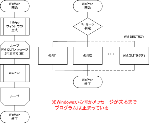 このプログラムは、Windowsから何かのメッセージが届くまで制御が戻ってこず、止まったままになっている(イベント・ドリブン方式)。