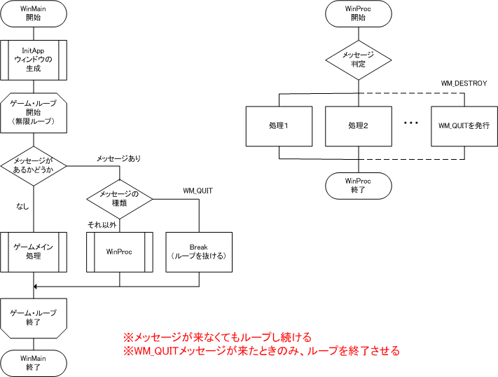 //----------------------------------------------------------------------------- // 関数名 : WinMain() // 機能概要: メイン関数、メッセージループの生成 //----------------------------------------------------------------------------- int WINAPI WinMain(HINSTANCE hThisInst, HINSTANCE hPrevInst, LPSTR lpszArgs, int nWinMode) { MSG msg; HWND hWnd; /* 表示するウィンドウの定義、登録、表示 */ if (!(hWnd = InitApp(hThisInst, nWinMode))) return FALSE; /* ゲーム・ループ */while (TRUE){if (PeekMessage(&msg, NULL, 0, 0, PM_NOREMOVE)) // メッセージがあるかどうか{if (!GetMessage(&msg, NULL, 0, 0)) // メッセージを取得し、WM_QUITかどうかbreak;TranslateMessage(&msg); //キーボード利用を可能にするDispatchMessage(&msg); //制御をWindowsに戻す}else // ゲームメイン処理{//UpdateFrame(hWnd); //UpdateFrame関数はまだ作っていないため、コメントアウトSleep(1);}}return msg.wParam; }《解説》
