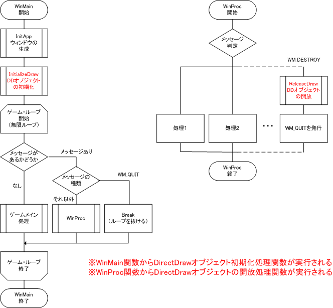 if (InitializeDraw(hWnd) != DD_OK) return FALSE;- ウィンドウを終了するときにDirectDrawオブジェクトを開放するようWinProc関数を修正する。