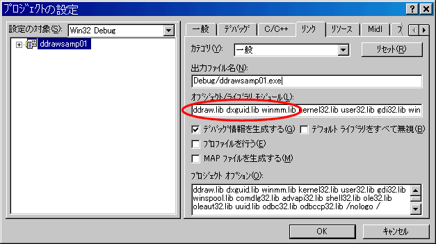 DirectDraw関係のライブラリを使用できるよう、プロジェクトの設定を変更しなければならないので、次のように設定する。