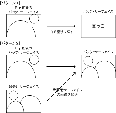 バック・サーフェイスに画像を転送し、フリップ処理によりプライマリ・サーフェイスとバック・サーフェイスを切り替えることにより行われる。つまり、フリップした直後はプライマリ・サーフェイスで表示していた画像が残っていることになる。