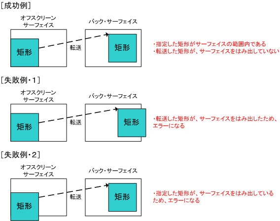 画像の矩形や転送先座標がサーフェイスからはみ出さないようなプログラムを組むことが重要である。
