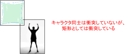 そこで、当たり判定用の矩形を画像の矩形よりも小さくとり、当たり判定用の矩形同士で当たり判定を行うテクニックを紹介する。