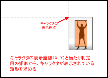 キャラクタの表示座標と当たり判定用矩形を元に、キャラクタ同士の当たり判定を行う。