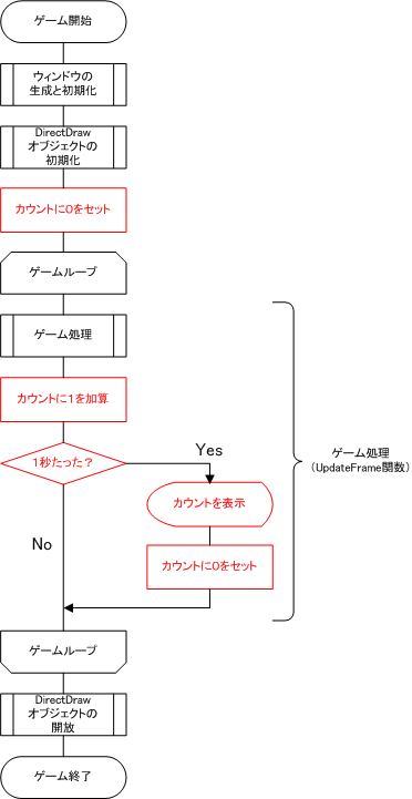 Windowsにはマシンを起動してからどれだけ時間がたっているかを調べるAPI関数として「TimeGetTime関数」「GetTickCount関数」がある。この関数を使い、ゲーム開始時とループ途中の経過時間を調べ、差分が1秒(1000ミリ秒)を超えるかどうかで判断する。![]()