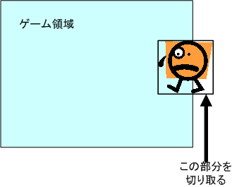 描画処理を行う直前に、表示する画像の矩形がゲーム領域をはみ出しているかを調べ、はみ出していない部分の矩形を求めてから、その矩形を利用して描画を行う。