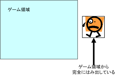 ゲーム領域が640×480で、100×100の画像を(600, 300)の位置に描画すると仮定する。この場合、描画される画像の左上の座標は(600, 300)だが、右下の座標が(600+100, 300+100)で( 700, 400)となり、右に700 - 640 = 60ピクセルはみ出してしまう。