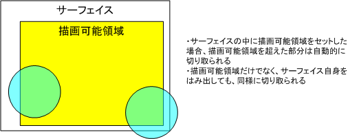 - 描画する画像がサーフェイスをはみ出した場合でも、はみ出した部分を自動的に切り取って、はみ出していない部分のみを表示してくれるため、