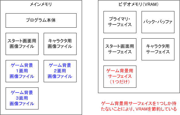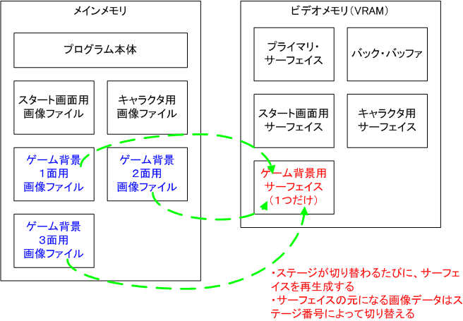 そこで、ステージで必要な背景画像のみをビデオ・メモリにロードし、ステージが切り替わったら、別の背景画像をロードし直すというプログラムを考える。![]()