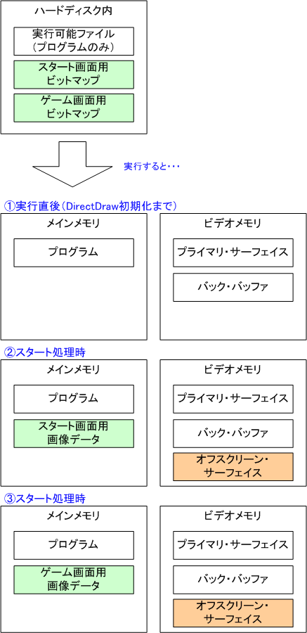 今までは、DirectDrawラッパー関数であるDDLoadBitmap関数を使い。リソースから画像データを読み込み、オフスクリーン・サーフェイスを生成してきた。