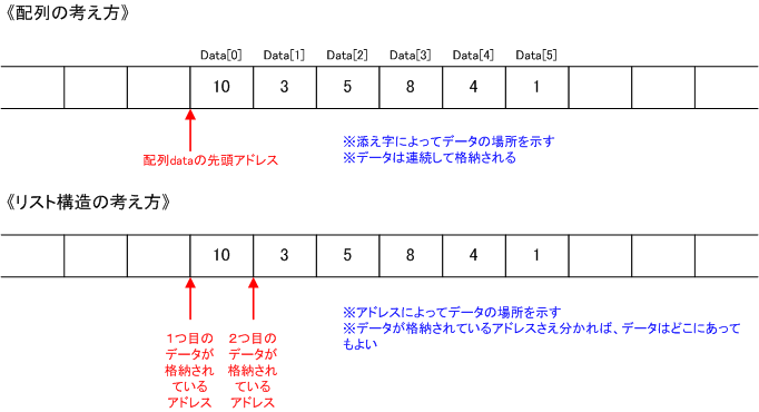 配列は、配列宣言時にメモリ上にすべての領域を確保するが、リスト構造を用いると、データが発生するたびにメモリ領域を1つずつ確保すればよい。