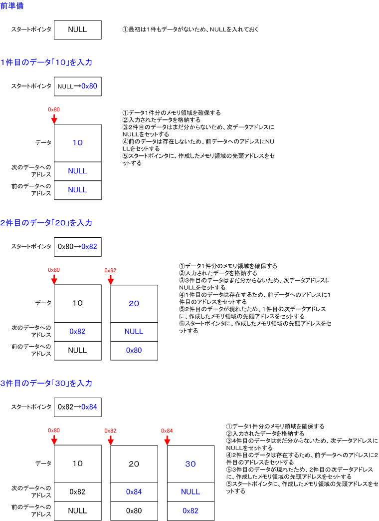 ※リスト構造を使う場合、実データのほかに、次のデータへのアドレスと前のデータへのアドレスを格納するポインタ変数を用意しなければならない