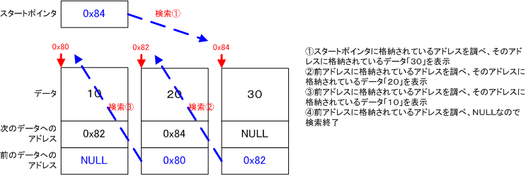 1件のデータに、前のデータが格納されているアドレスと、次のデータが格納されているアドレスを持たなければならないため、データ1件の容量は多少多くなるが、配列の大きさによる限界がなくなる。![]()