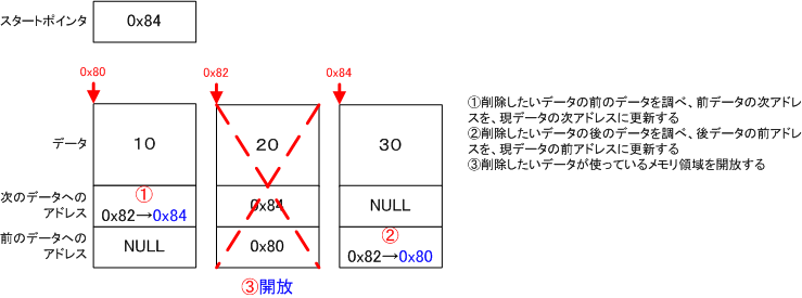 typedef struct tarDATATBL { int data; // データ tarDATATBL *next; // 次アドレス tarDATATBL *prev; // 前アドレス } DATATBL; DATATBL *start_p; // スタートポインタ DATATBL *wp; // 作業用ポインタ ・・・wpに削除したいデータのアドレスが入っているとする・・・ /* 前データのnextを更新 */ if (wp->prev != NULL) wp->prev->next = wp->next; /* 次データのprevを更新 */ if (wp->next != NULL) wp->next->prev = wp->prev; else start_p = wp->prev; /* 開放 */ free(wp);※削除したいデータが一番先頭、または一番最後である場合のことも考えなければならない