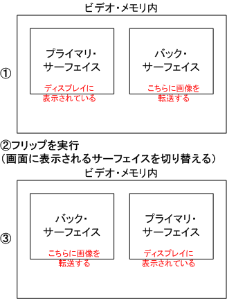 ビデオメモリ上に画面表示用の領域を作成し、そこに画像を転送すればディスプレイ上に画像が表示される。しかし、表示のタイミングは画像の転送とは連動していないため、この方法では描いている(転送している)途中の状態が見えてしまう場合があり、ゲームには向かない(画面がちらつく)。