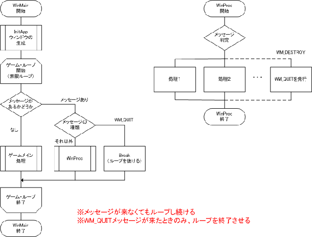 上記のフローチャートのようにWinMain関数を改造すると次のようになる。