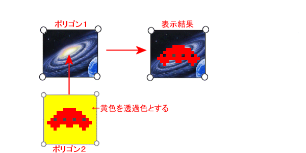 上図のようにポリゴン1(背景画像)の上にポリゴン2(キャラクタ画像)を配置した場合、指定した透過色の部分(上図では黄色)が透明になる。