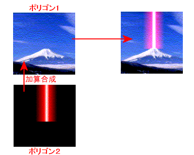 複数のテクスチャが重なり合った時、通常は上にかぶさるように表示される。加算合成を行うと、重なった部分のRGBがそれぞれ加算され、結果、重なった部分が明るく表示されるようになる。
