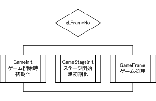 ゲーム開始時に1度だけ初期化をする変数と、ステージが切り替わるたびに初期化する変数があるため、初期化処理関数を「GameInit()」「GameStargeInit()」の2つに分割した。