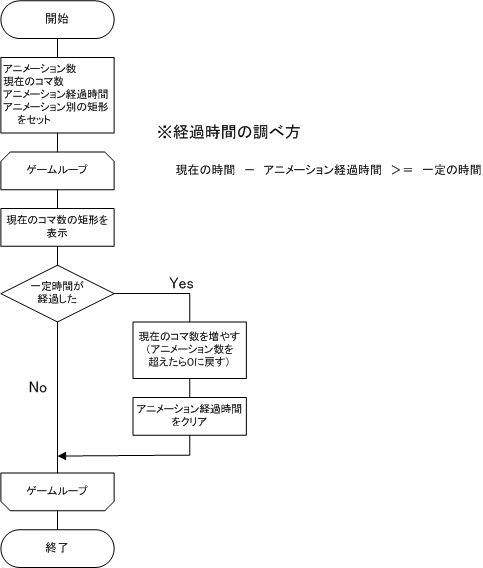 今何枚目を表示しているかという情報と、画像を切り替えたときの時間をキャラクタ構造体に持つ。これにより、tuの値を計算できるため、アニメーションの数が増えてもプログラムの修正を必要最小限に抑えることができる。