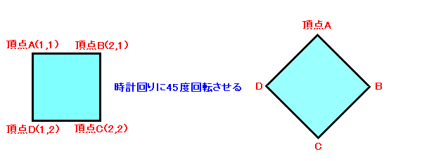 ポリゴンを回転させるには、ポリゴンの頂点座標を修正すればよい。しかし、90度、180度、270度の回転なら、4つの頂点座標を入れ替えるだけなのでプログラミングも楽だが、それ以外の角度で回転させようとすると、回転させる角度によって頂点座標を計算しなければならず、面倒である。
