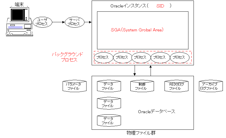 - SGA(System Global Area)とバックグラウンド・プロセスがOracleインスタンスを構成し、このOracleインスタンスに対して識別子(SID)がつけられる。