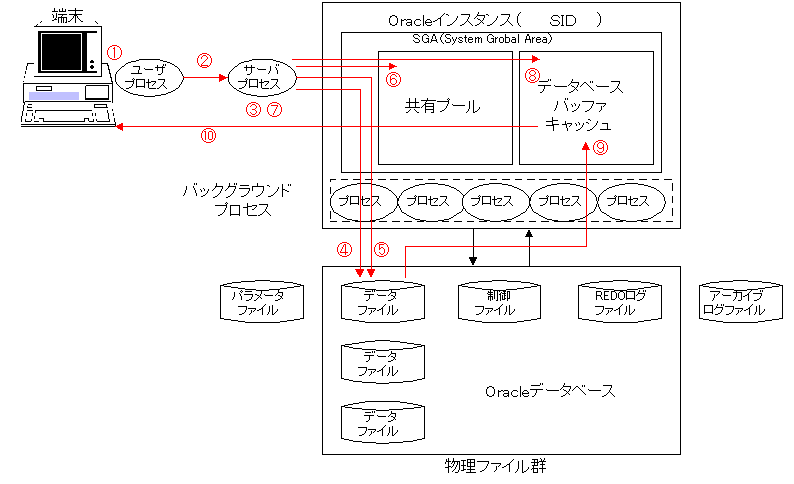 処理を実行する。 該当データが、SGA内の「データベース・バッファ・キャッシュ」に置かれているかどうかをチェックする。 該当データが置かれていない場合は、ファイルから該当データを取り出し、データベース・バッファ・キャッシュに置く。 該当データをユーザ・プロセスに返す。