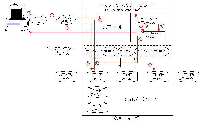 該当行をロックする。 変更前、変更後データをREDOログ・バッファに書き込む。 変更前データを、ロールバック・セグメントに書き込む。 データの該当行を変更する。※ロックやロールバック・セグメントにかかれた情報などは、トランザクション終了(COMMIT、ROLLBACK)時に開放される。